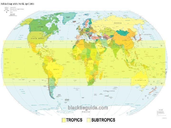 The Tropic of Cancer is 23½ degrees north of the equator, and the Tropic of Capricorn at 23½ degrees south of the equator. The 23½ degrees reflect the amount of tilt that the Earth has on its axis relative to the sun. This is why we have different seasons at locations away from the equator.