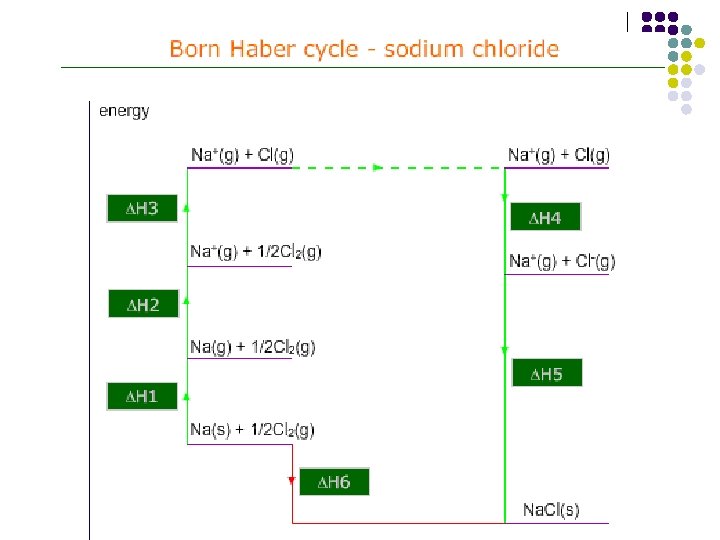 Steps in the formation of Na. Cl 1: Na(s) + ½ Cl 2(g) → Na. Cl(s) ∆Hf = -411 k. J 2: Na(s) → Na(g) ∆H°f = 108 k. J 3: 1/2 Cl 2(g) → Cl(g) ∆H°f = 122 k. J 4: Na(g) → Na+(g) + e I 1(Na) = 496 k. J 5: Cl(g) + e → Cl-(g) E(Cl) = -396 k. J 6. Overall : ΔH 6= Σ Δ H 1 to Δ H 5