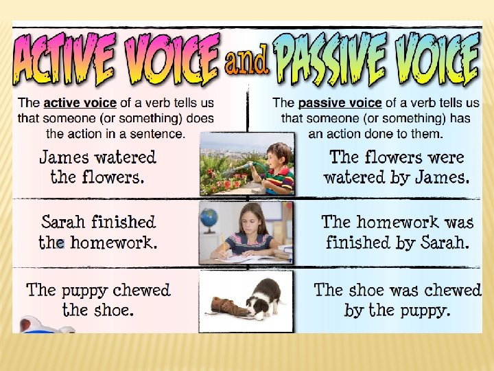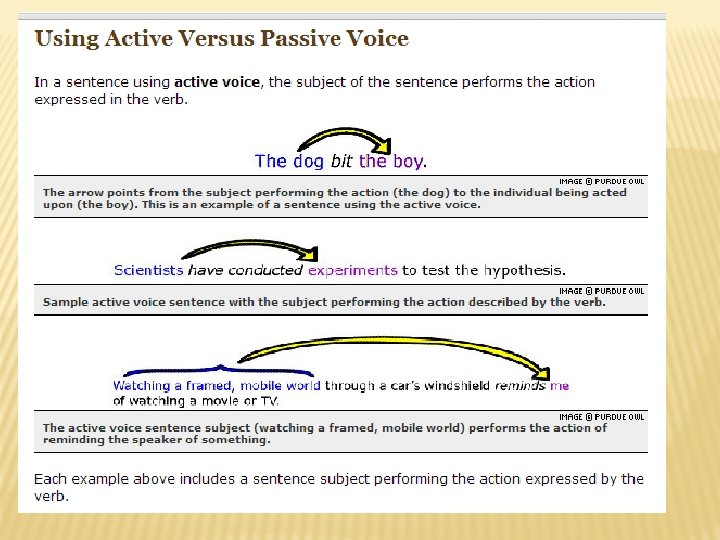PASSIVE VOICE VERBS � You can recognize passive voice because the verb phrase will include a form of be (was, am, are, been, is). Don't assume that just because there is a form of 'be' that the sentence is passive. � � Example: The research was conducted over a period of 10 weeks. Sometimes a prepositional phrase like "by the" in the sentences above indicates that the action is performed on the subject, and that the sentence is passive. � Example: The experiment was conducted by the researcher.