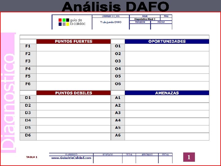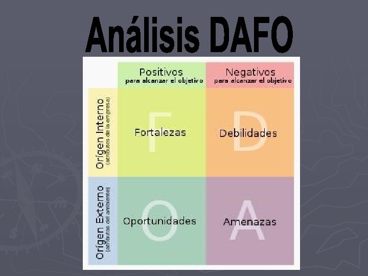 v Antes de tomar cualquier decisión estratégica, es imprescindible realizar un diagnóstico de nuestra organización. v El análisis DAFO es el método más sencillo y eficaz para decidir sobre el futuro. v Permite: * Determinar las ventajas competitivas de la empresa * Buscar la estrategia a emplear en función de las características propias de la empresa y de las del mercado en que se mueve.
