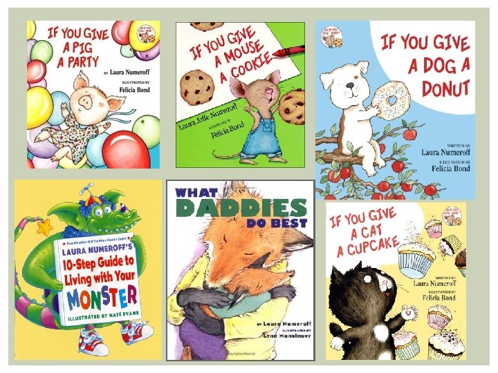 CONCLUSION Laura Numeroff has proved to be very successful with over 30 different books published during her career so far. Her titles grab your attention and most involve animals which children enjoy She has created a variety of themes that many of her books seem to fall under. § If You Give… § What____&____ Does Best § ____&____ Don’t Wear Her books are just FUN to read!