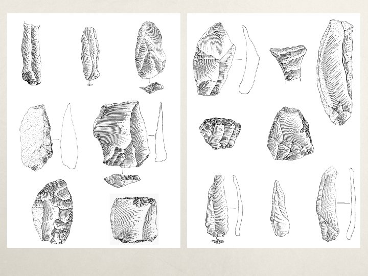 MUSTERIANO a DENTICOLATI • bassa percentuale di raschiatoi tipo Quina • abbondante presenza di incavi e denticolati • bifacciali rari o assenti • coltelli a dorso rari o assenti • percentuale variabile di supporti Levallois