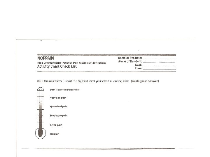 • • • • • • • • Discomfort Behaviour Scale Elderly Pain Caring Assessment 2 (EPCA-2) Facial Action Coding System Pain Behaviour Checklist (PBC) The Nonverbal Pain Assessment Tool Pain Assessment Checklist for Seniors with Limited Ability to Communicate (PACSLAC) Pain Assessment in Advanced Dementia (PAINAD) Disability Distress Assessment Tool (Dis. DAT) Discomfort Scale for Patients with Dementia of the Alzheimer's Type (DS-DAT) DOLOPLUS-2 Mobilization Observation Behaviour Intensity Dementia Pain Scale (MOBID) Mobilization Observation Behaviour Intensity Dementia Pain Scale 2 (MOBID-2) Checklist of Nonverbal Pain Indicators (CNPI) Certified Nursing Assistant Pain Assessment Tool (CPAT) The Abbey Pain Scale (The Abbey) The Non-Communicative Patient's Pain Assessment Instrument (NOPPAIN) Pain Assessment for the Dementing Elderly (PADE) The Assessment of Discomfort in Dementia (ADD) Protocol The Hospice Approach Discomfort Scale Davies et al. (2004) pain assessment tool The Aged Care Pain Chart The Behaviour Checklist The Facial Grimace Scale The Pain Behaviours for Osteoarthritis Instrument for Cognitively Impaired Elders (PBOICIE) The Face, Legs, Activity, Cry and Consolability Pain Assessment Tool (FLACC) Pain Assessment in the Communicatively Impaired (PACI) The Pain Assessment Tool in Confused Older Adults (PATCOA) Amy’s Guide The Simons and Malabar Pain Scale