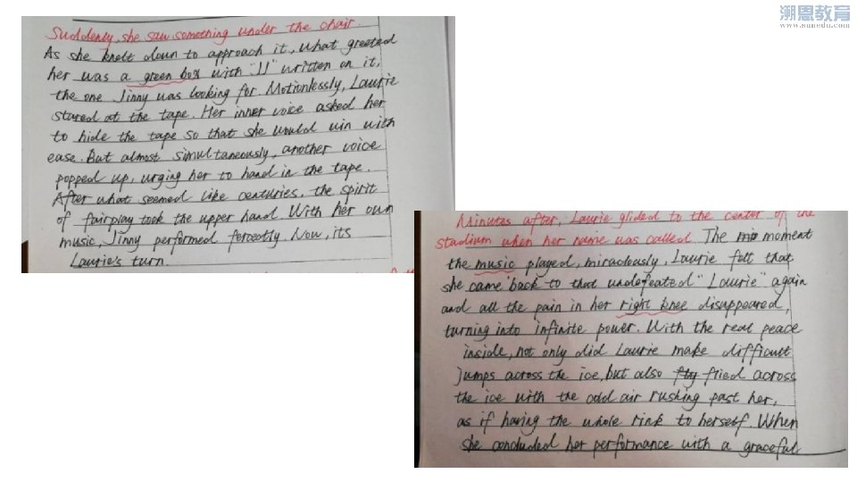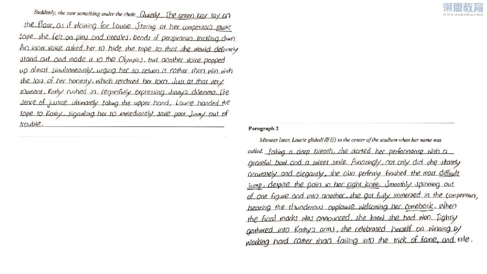 Suddenly, she saw something under the chair. As she knelt down for it, what greeted her was a green box with initials J. J. written on it, the one that Jinny was looking for. Motionlessly, Laurie stared at the tape. Her inner voice asked her to hide the tape so that she could win the competition with ease. But almost simultaneously, another voice popped up, urging her to hand in the tape. After what seemed like hours, the idea of fair play finally took the upper hand. Of course with the suitable music accompanying, Jinny performed perfectly. And then came Laurie’s turn. Minutes later, Laurie glided(滑行) to the center of the stadium when her name was called. The moment the music played, miraculously, she felt as if the undefeated Laurie came back, and the pain in the right knee had disappeared, turning into infinite power. With the inner peace, not only did Laurie make the most difficult jumps across the ice, she also flew smoothly across the ice with the cold air brushing past her, as if having the whole rink to herself. When she concluded her performance with a graceful bow, applause filled every corner of the rink. She did make a comeback! 点评: 1. What greeted her was运用了主语 从句,并且用with+ 复合宾语,是整 个句子的表达更高级。 2. 描写“内心的纠结”部分写得很出彩, 语言和内容都很丰富,也体现了作者 驾驭长句子的能力。 3. Took the upper hand 用得很地道、 精炼。 4. 最后一句话And then came Laurie’s turn很自然地起到了承启的作用。 点评: 1. Not only…also. . 不但运用了倒 装结构,而且很恰当地把多个滑 冰动作有机融合,尤其是as if having the whole rink to herself把 Laurie自信的一面淋漓尽致地展现。