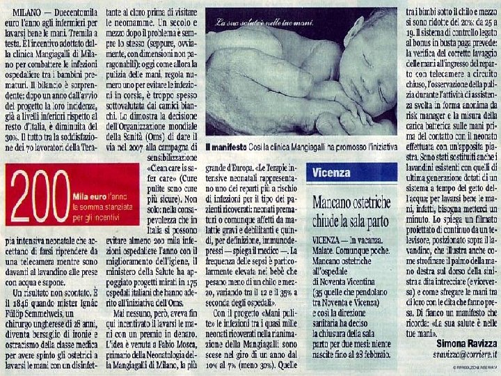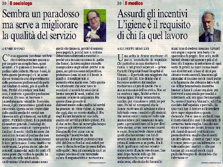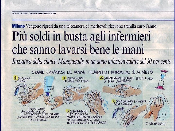 DOCTORNEWS 8 luglio 2009 - Anno 7, Numero 123 Gb, test delle mani pulite ai sanitari Test delle 'mani pulite' per medici e infermieri britannici, che grazie a un piccolo apparecchio montato sui letti dei pazienti saranno colti in flagrante se igienicamente carenti. Il monitor chiamato 'Hy. Green', una sorta di 'grande fratello' dell'igiene in corsia - si legge sul 'Daily Mail' - trasmette infatti una luce verde se l'operatore sanitario ha le mani appena lavate, mentre si illumina di rosso se non sono adeguatamente pulite. E il camice bianco viene rispedito in bagno. In Gran Bretagna, dove il piccolo sistema sta per essere adottato in molti ospedali, ogni anno cinquemila persone muoiono a causa delle famigerate infezioni ospedaliere, prevenibili semplicemente lavando le mani di frequente. Oltre all'apparecchio, medici e infermieri indosseranno uno speciale badge che registra l'ora esatta in cui si è toccato il sapone o il disinfettante cutaneo, e i dati verranno trasmessi agli specialisti del controllo delle infezioni.