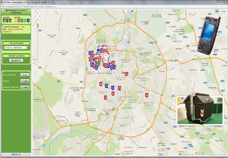 Localizzazione e manutenzione cassonetti con My. Fleet. Eco Le soluzioni per il tracciamento dei contenitori consente di individuare la posizione su territorio di ogni singolo cassonetto del proprio parco in tempo reale. In questo modo sarete in grado di adattarvi rapidamente ai nuovi sviluppi e prendere decisioni attente e consapevoli. Il sistema di tracciamento cassonetti oltre alla geo localizzazione visibile su mappa Google, offre accesso immediato alle informazioni sullo stato di manutenzione degli stessi. My. Fleet. Eco consente di generare report precisi e affidabili basati su numerosi parametri separati in base alle informazioni caricate sul palmare in dotazione all’operatore. Questi includono, tra gli altri, i danni rilevati sul contenitore, i ricambi utilizzati e l’esatta collocazione sul territorio mediante indirizzo e coordinate GPS. I dati raccolti in tabelle personalizzabili possono essere, tramite report, trasformate in files esportabili in formato PDF o Excel. ØLocalizza in tempo reale la posizione e lo stato di manutenzione dei contenitori ØDimostrazione dell’avvenuta regolarità delle manutenzioni effettuate ØConsulta lo storico delle ispezioni e posizioni ØInvia comunicazioni e missioni agli operatori ØVisualizza ed esporta report riassuntivi