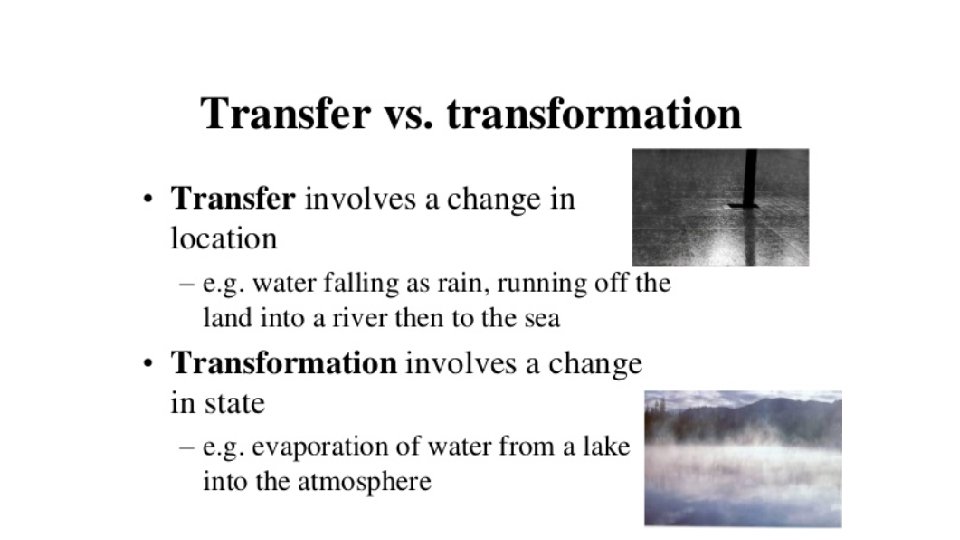 Transfer and Transformation • Transfers involve flow through a system and involve a change in location • The movement of material in a non living process Super genius about to be transferred over the waterfall