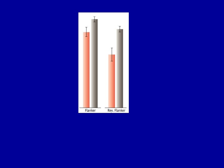 Test: Flanker Task • One shape inside another: focus on central shape, not “flanker” • Press right for central triangle, left for central circle • Reverse flanker: now focus on outside shape • Must remember where to focus Inhibit attention to distractor • 65%(chance) in control grp; 84% in exptl. group