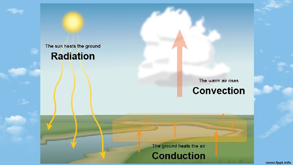 Convection is the transfer of heat energy in a fluid – through convection currents! This type of heating is most commonly seen in the kitchen when you see liquid boiling. Air in the atmosphere acts as a fluid. The sun's radiation strikes the ground, thus warming the rocks. As the rock's temperature rises due to conduction, heat energy is released into the atmosphere, forming a bubble of air which is warmer than the surrounding air. This bubble of air rises into the atmosphere. As it rises, the bubble cools with the heat contained in the bubble moving into the atmosphere. The warm air rises = convection