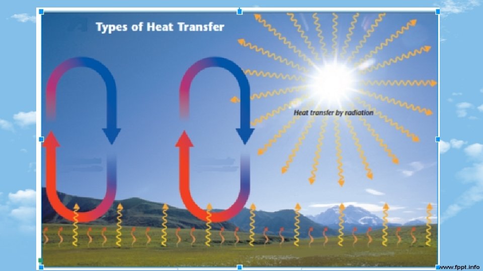 Radiation • If you have stood in front of a fireplace or near a campfire, you have felt the heat transfer known as radiation. The side of your body nearest the fire warms, while your other side remains unaffected by the heat. • Radiation is the transfer of heat energy through space by electromagnetic radiation. (through waves!) • Most of the solar radiation is absorbed by the atmosphere and much of what reaches the earth's surface is radiated back into the atmosphere to become heat energy. • The sun heats the ground = radiation