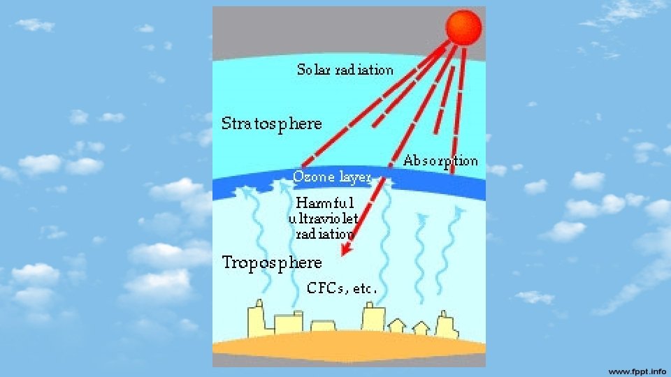 Ozone Layer • A gas made up of 3 OXYGEN ATOMS (O 3) • Protects life on earth by absorbing harmful UV (ultraviolet radiation) from the Sun – Too much UV rays can cause: • Cancer • Sunburn • Damaged eyesight • Absorbs UV rays but lets other types of radiation to pass through – Visible light