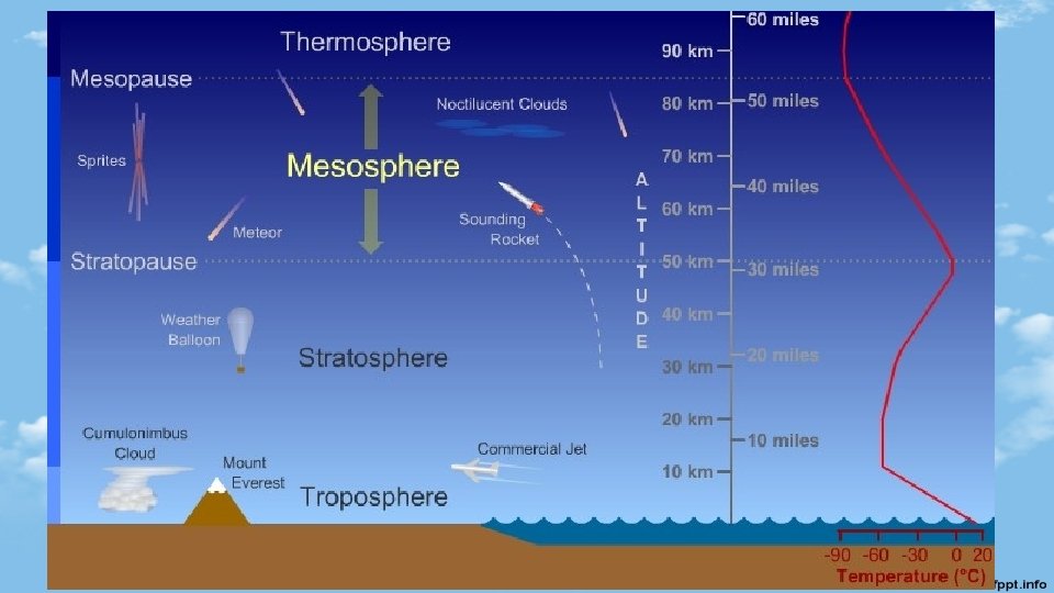 Mesosphe re • Air is extremely thin • Less than 0. 1 % of atmosphere’s mass • Most meteors burn up here • Temperature decreases as you move upward because it is heated from the ozone layer in the stratosphere • Meso – middle • 31 -56 miles (50 -90 km) • 32 – (-)120°F