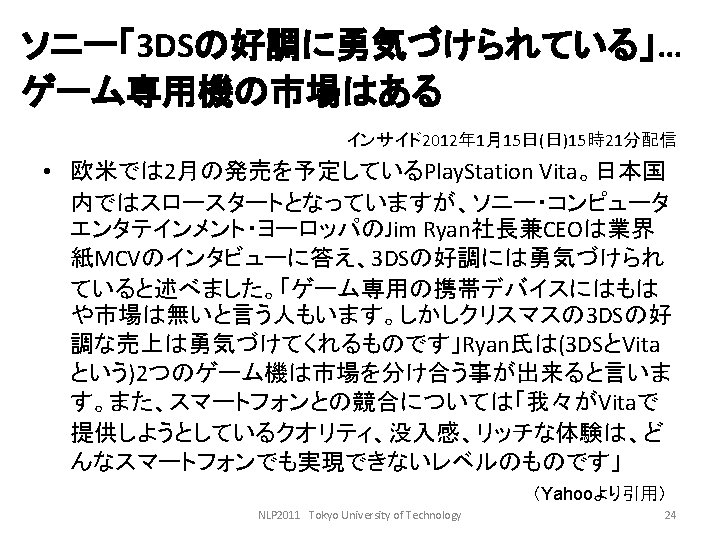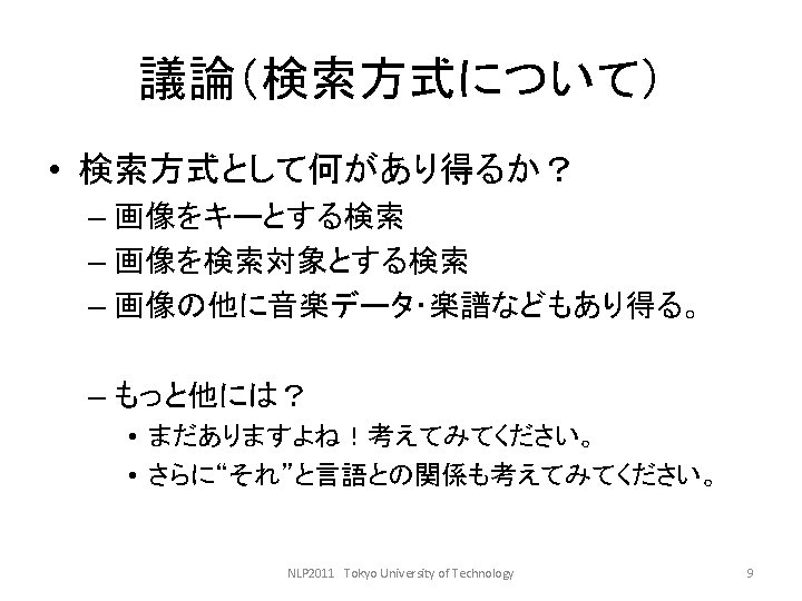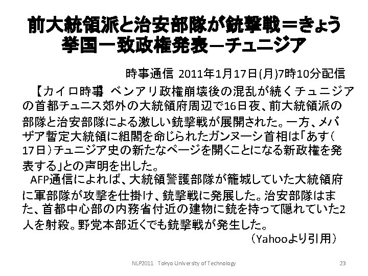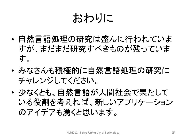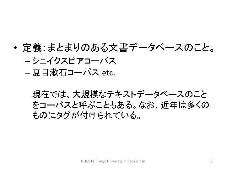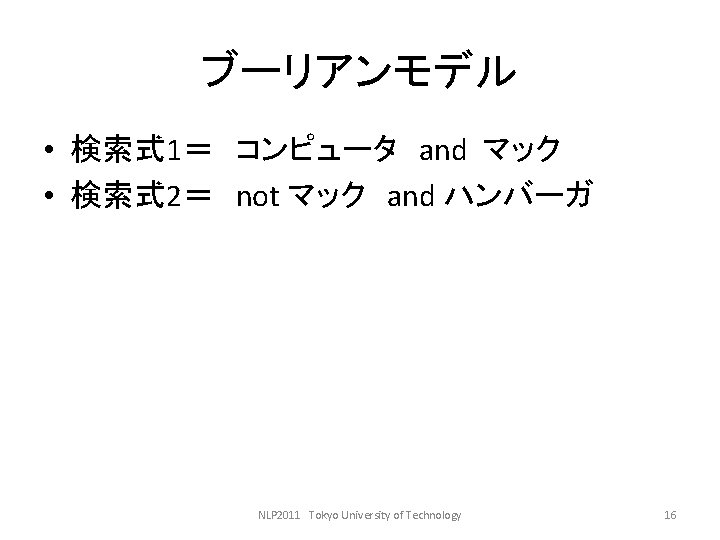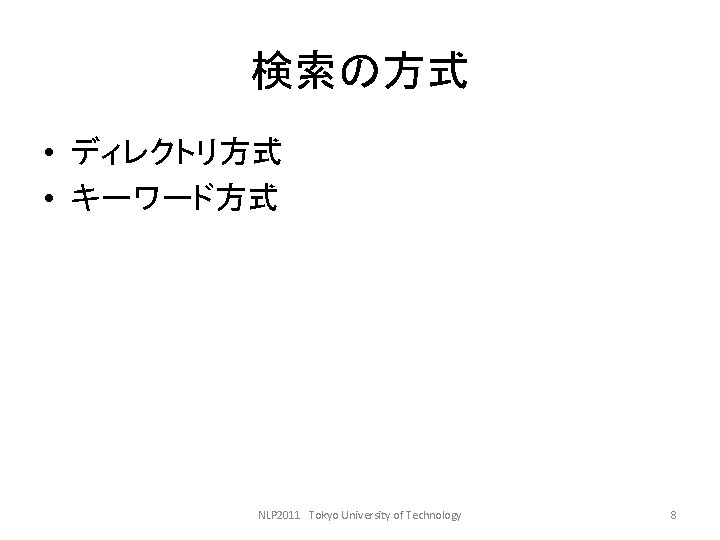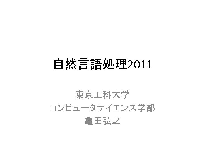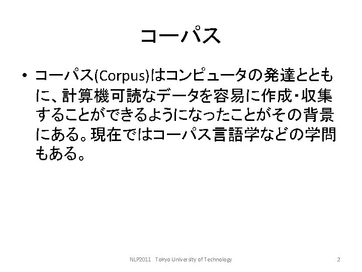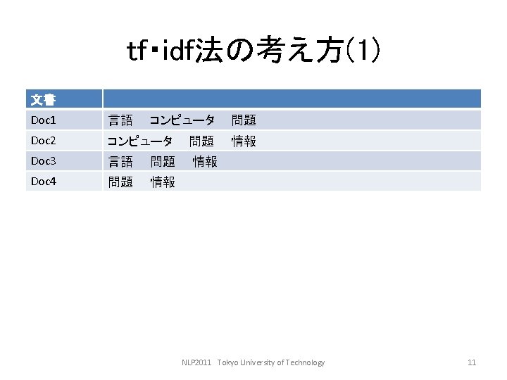 LDCwww ldc upenn edu ELRAwww elra info GSK Slides: 27 Download presentation 言語資料関係のサイト • • LDC(www. ldc. upenn. edu) ELRA(www. elra. info) GSK(言語資源協会, www. gsk. or. jp) RSC(音声資源コンソーシアム, research. nii. ac. jp/src/) • 言語情報処理ポータル: nlp. kuee. kyoto-u. ac. jp/NLP_Portal/ NLP 2011 Tokyo University of Technology 5 語の重要度の計算法 • tf・idf法 NLP 2011 Tokyo University of Technology 10 tf・idf法の考え方(2) キーワード 文書 言語 Doc 1 Doc 3 コンピュータ Doc 1 Doc 2 問題 Doc 1 Doc 2 Doc 3 Doc 4 情報 Doc 2 Doc 3 Doc 4 NLP 2011 Tokyo University of Technology 12 tf・idf法の考え方(3) TF Doc 1 DOc 2 Doc 3 Doc 4 IDF 言語 2 0 1 0 2 コンピュータ 1 1 0 0 2 問題 2 2 3 1 1 情報 0 1 2 1 1. 3 NLP 2011 Tokyo University of Technology 13 tf・idf法の考え方(4) TF・IDF Doc 1 Doc 2 Doc 3 Doc 4 言語 4 0 2 0 コンピュータ 2 2 0 0 問題 2 2 3 1 情報 0 1. 3 2. 6 1. 3 NLP 2011 Tokyo University of Technology 14 検索モデル • ブーリアンモデル(Boolean model) • ベクトル空間モデル NLP 2011 Tokyo University of Technology 15 コサイン尺度 NLP 2011 Tokyo University of Technology 18 例: • 教科書p. 143参照 NLP 2011 Tokyo University of Technology 19 検索結果の評価式 • 適合度(精度, Precision) • 再現率(Recall) PとRの調和平均Fをとる。 NLP 2011 Tokyo University of Technology 20 検索評価の練習 c b a d NLP 2011 Tokyo University of Technology 21