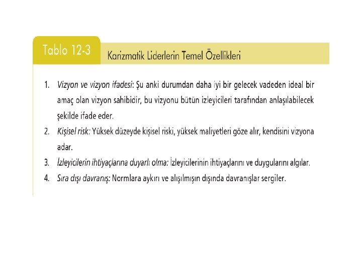 Karizmatik Liderlik Ve Dönüştürücü Liderlik Karizmatik Liderlik Teorisi: Sıra dışı davranışlarla karşılaştıklarında astların lidere olağanüstü ve kahramanca yetenekler atfettiği liderlik teorisi.
