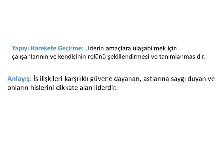 Davranışçı Teoriler Özellik kuramlarının liderliği açıklamada yetersiz kalması sonucu araştırmacılar lider davranışlarını analiz ederek, lider davranışlarının temel yönelimini belirlemeye çalışmışlardır. Lider davranışının, GÖREV ve İLİŞKİ olan iki önemli boyutu üzerinde durmuştur. Ohio State Üniversitesi araştırmaları , Michigan Üniversitesi araştırmaları, Likertsistem 4 kuramı, Yönetim gözeneği kuramı(Blake ve Mouton). 1940’ların sonunda Ohio Devlet Üniversitesi’nde lider davranışının bağımsız boyutlarını tanımlamayı amaçlayan çalışmalar sonucunda en kapsamlı ve en çok izlenilen davranış teorileri ortaya konulmuştur. Binden fazla boyut ile başlayan çalışmalar, çalışanlar tarafından tanımlanan en çok iki liderlik davranışına kadar daraltılmıştır. Araştırmacılar bunları “yapıyı harekete geçirme” ve “anlayış” olarak adlandırmaktadırlar. a) Yapıyı harekete geçirme b) Anlayış