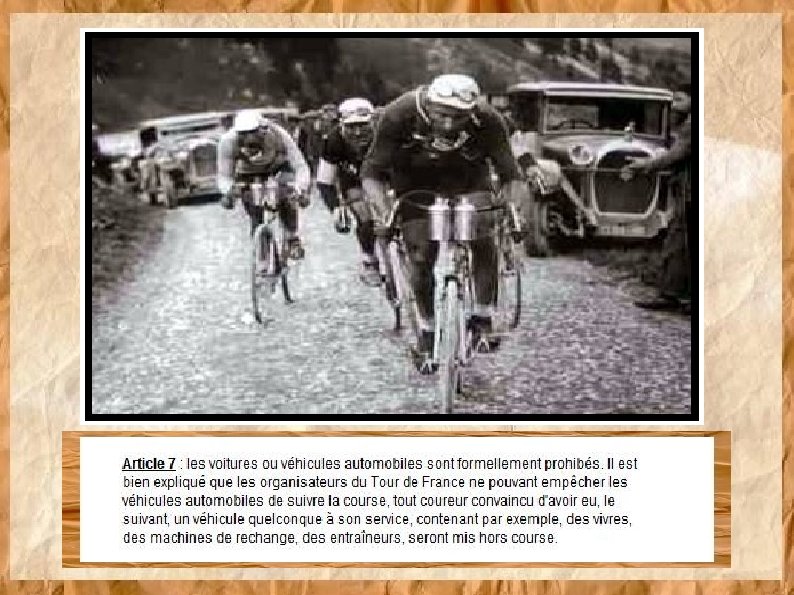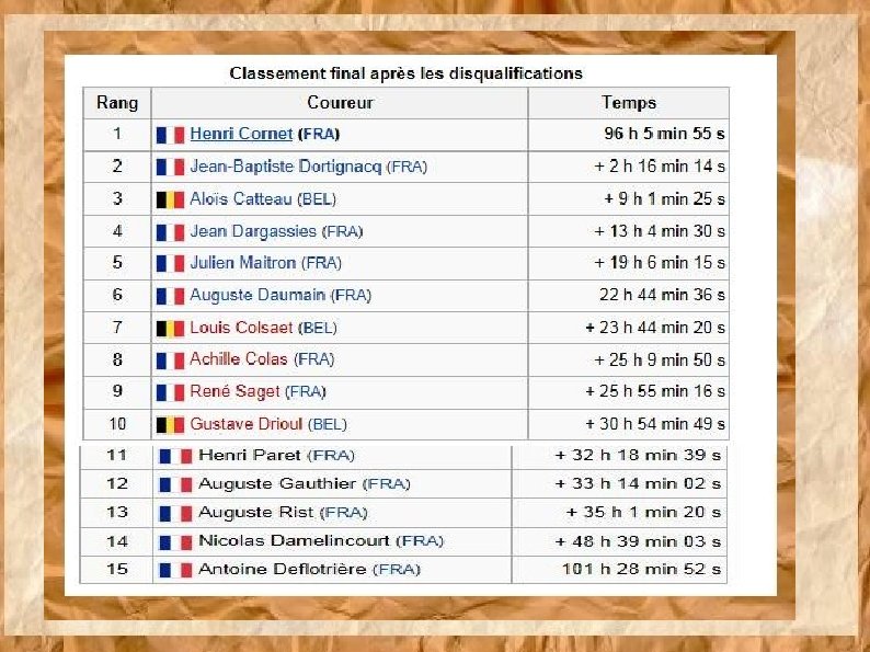 2 eme édition Ce Tour aura bien failli être le dernier du fait d' innombrables tricheries et scandales, venant de tous bords. Coureurs ou équipe ? supporters Le parcours restera Identique Partants : 88 Arrivants : 27 12 disqualifiés Arrivants réels : 15