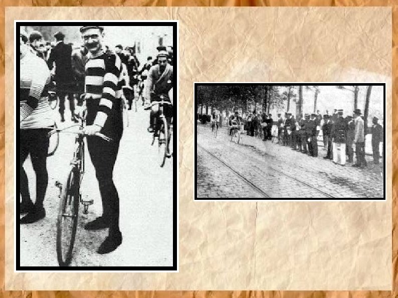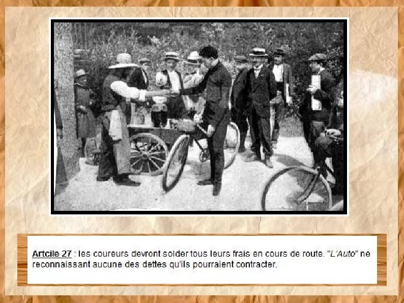 Maurice Garin, avec son soigneur et son fils, est muni de l' écharpe bleu blanc rouge et du brassard Vert, signe du vainqueur, Le maillot jaune apparaîtra en 1919, en hommage. à Desgrange et son journal l Auto, appelé le petit jaune