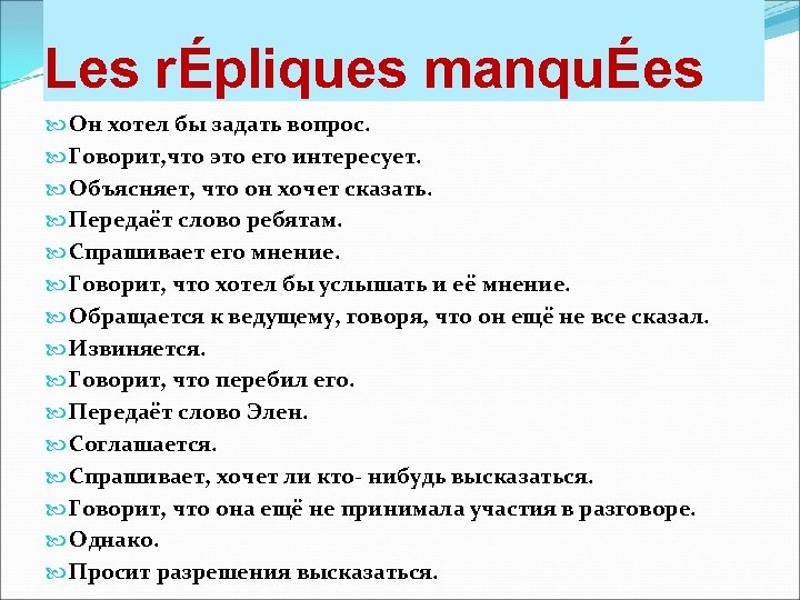 Les rÉpliques manquÉes J’ai une question à vous poser. Je trouve ça intéressant. Ce que je veux dire, c’est Vous avez la parole. Et toi, ton avis? J’ aimerais bien avoir ton avis. Pardon, je ne vous ai pas encore tout dis. Pardon, je t’ai interrompu. Je n’ai pas terminé, s’il vous plaît. Je passe la parole à Hélène. Je suis de ton avis. Qu’est-ce que vous en pensez? Je n’ai rien encore dit. Cependant. Si vous permettez , je voudrais dire quelque chose.