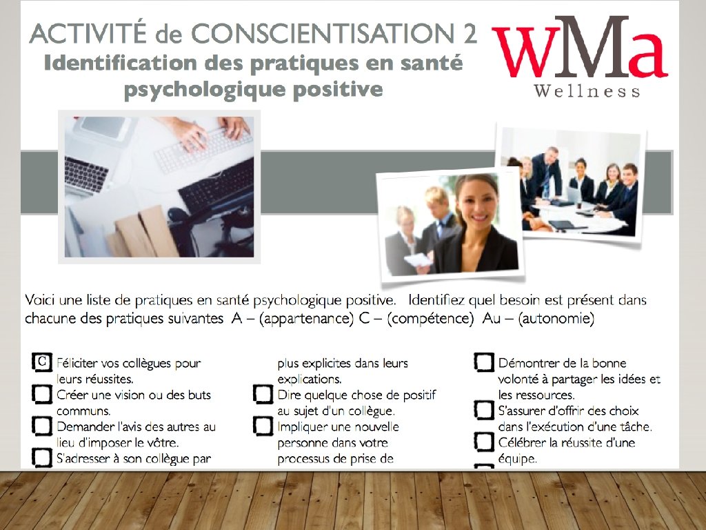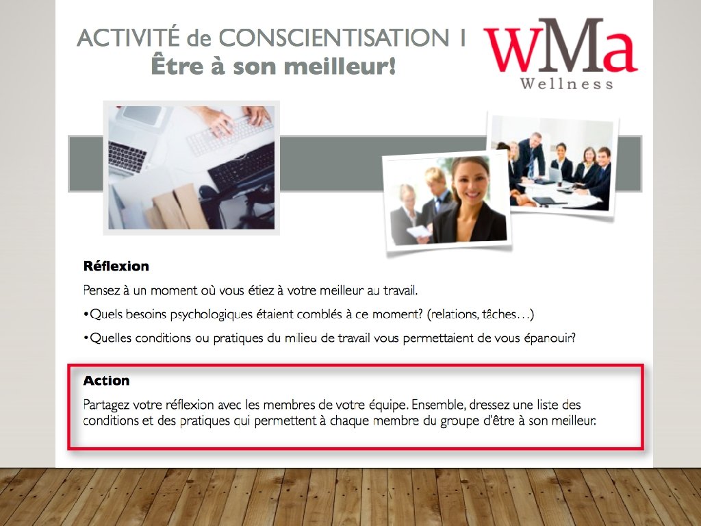 OBJECTIFS • Être sensibilisé au domaine de la santé mentale positive • Comprendre les trois besoins du mieux-être et les pratiques qui les soutiennent • Connaître les ressources et leur utilisation • Avoir un plan pour promouvoir les pratiques du mieuxêtre dans le milieu de travail