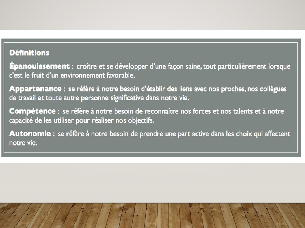 LES BESOINS DU MIEUX-ÊTRE Le besoin d’appartenance • Se réfère à notre besoin de connexion avec nos proches, avec nos collègues de travail et toute autre personne significative dans notre vie. • Ce besoin est nourrit par nos interactions avec les autres, notre participation au sein d’une équipe, et du soutien et de l’encouragement que l’on reçoit des autres. ***** “Je fais parti d’un groupe de travail et de ma communauté organisationnelle. ” “Je me sens inclue, encouragé et appuyé par mes collègues dans mon organisation. ”