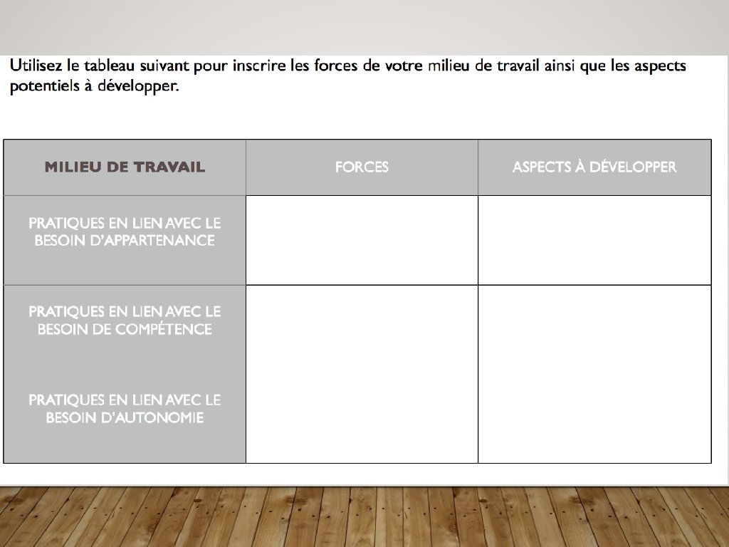 HYPOTHÈSES • Les gens possèdent des forces et des talents qui leur permettent d’initier, de diriger, et de nourrir des aspects positifs dans leur vie personnelle et au travail (Hamilton & Ham 2004; Losier & Morrison, 2007). • Le développement positif et la capacité du changement dépendent du niveau d’engagement et de l’affirmation de soi (empowerment) (CSPH, 2002; Deci & Ryan, 2007).
