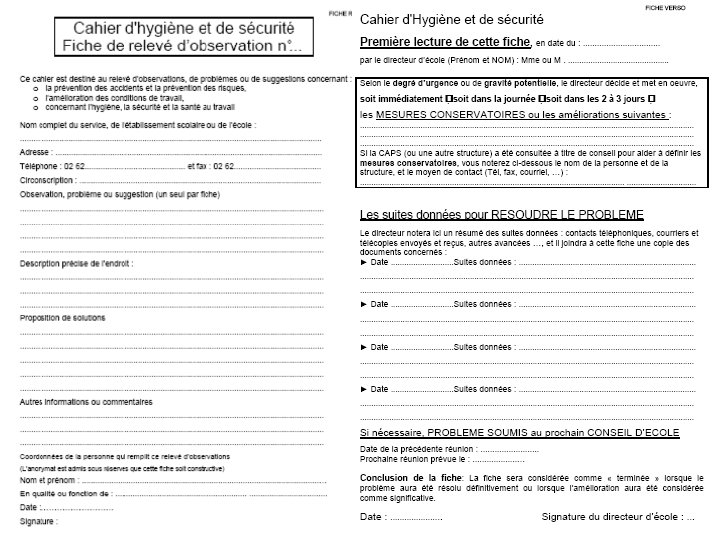 Les objectifs du cahier hygiène et sécurité l Permettre à tout personnel ou usager de signaler une situation potentiellement dangereuse. l Assurer la traçabilité de la prise en compte du problème. l conserver un historique des problèmes pour l’exploiter dans le document unique d’évaluation des risques professionnels.