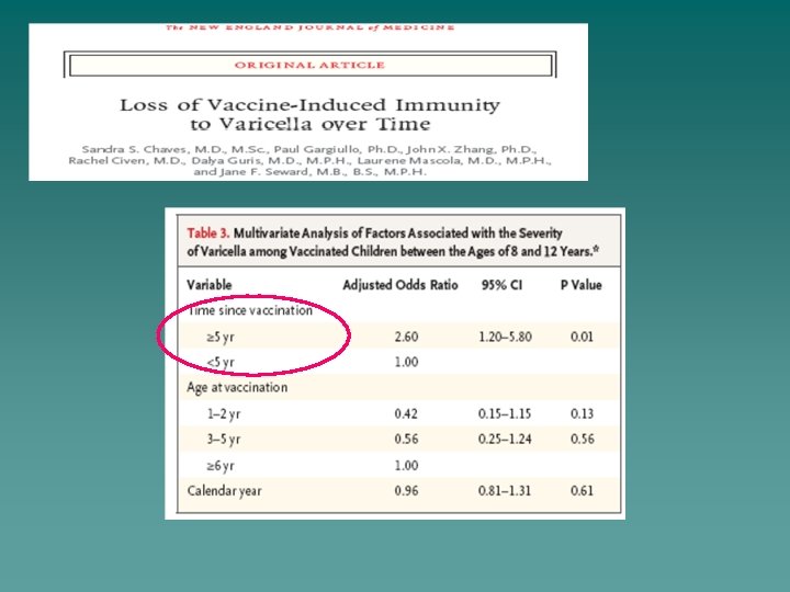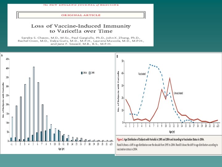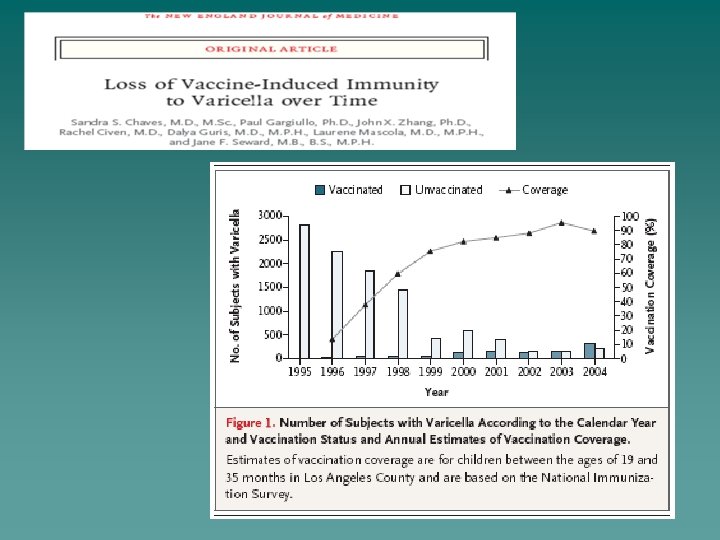 Varicelle Expérience américaine: – Vaccination généralisée à partir 12 mois – 1 dose: 80 -85% protection: échecs vaccinaux – Perte d’immunité après 5 ans Changement d’épidémiologie varicelle Recommandation d’une 2ème dose à 4 -6 ans depuis 2007: pas de données long terme: rappels?