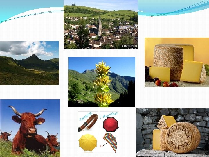 � Das Cantal liegt im Südwesten der Auvergne. Sein Spitzname ist das grüne Land. Es gibt dort viele Wiesen, Vulkane, Wälder und vielleicht heiβt es so, weil es dort regelmäβig regnet. � Die Hauptstadt ist Aurillac und dort wohnen 26572 Menschen. Es gibt 2 bekannte Käsesorten: der Cantal und der Salers. « Salers » ist auch eine Kuhrasse und ein Aperitif aus Enzian. In Aurillac werden Regenschirme hergestellt und in die ganze Welt exportiert. � Die Landschaft hat viele Flüsse und einige Seen. Der höchste Vulkan ist 1855 Meter hoch und heiβt « Plomb du Cantal » . � Le Cantal se situe au Sud-ouest de l’Auvergne. Son surnom est « Le pays vert » , car il y a beaucoup de prairies, de volcans, de forêts et peut-être parce qu’il y pleut souvent. � La capitale est Aurillac. 26 572 personnes y vivent. Il y a 2 sortes de fromage connues: le Cantal et le Salers. « Salers » est aussi une race de vaches et un apéritif à base de gentiane. A Aurillac sont fabriqués des parapluies qui sont exportés dans le monde entier. � Le paysage a beaucoup de fleuves et de lacs. Le plus haut volcan fait 1855 mètres de haut et s’appelle « Le Plomb du Cantal » .