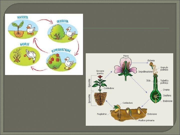 Il ciclo vitale Gli organismo animali e vegetali, pur essendo molto diversi tra loro, presentano delle caratteristiche comuni che permettono di definirli esseri viventi. Ogni essere vivente è caratterizzato da un ciclo vitale: Insieme dei processi che attraverso la crescita e la riproduzione portano alla nascita di nuovi individui a alla trasmissione della vita.