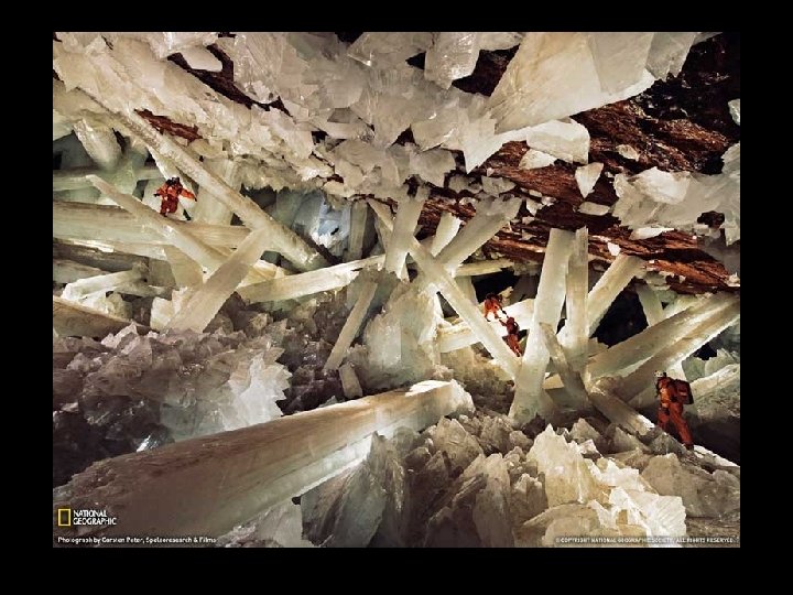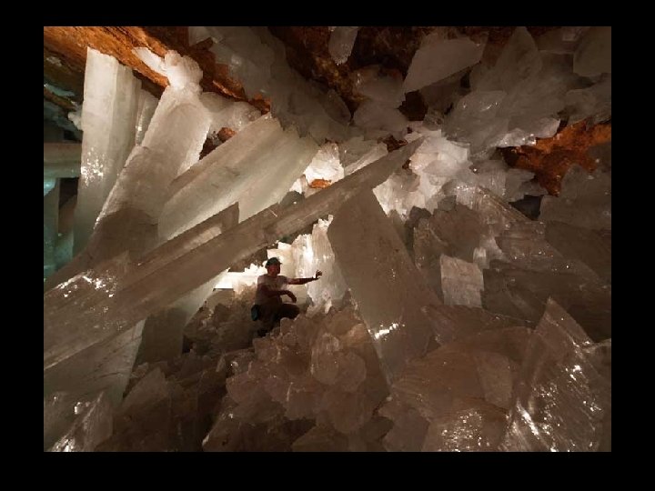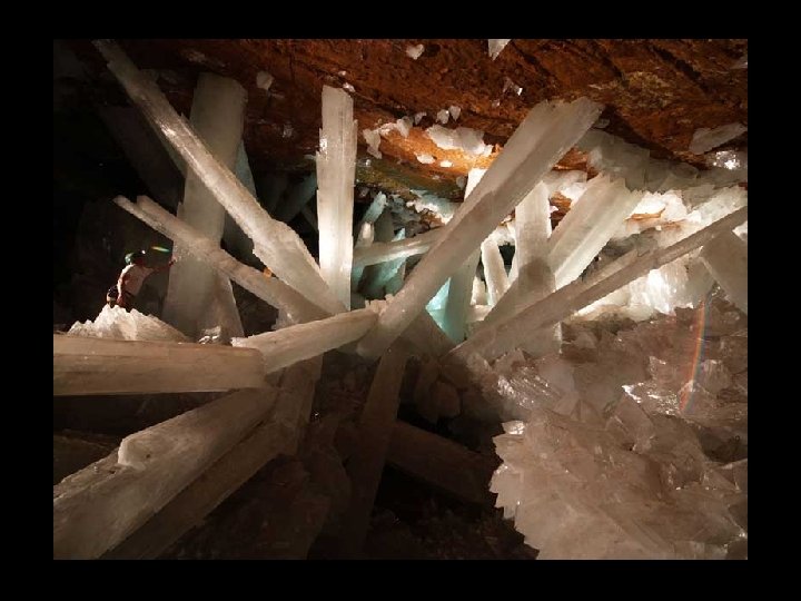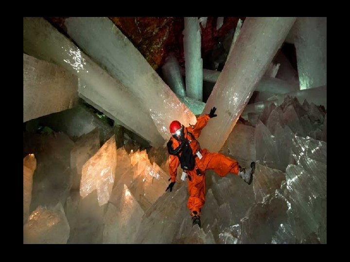 Crystal Cave situé à 300 m sous terre dans la mine de Naica, au nord de México, il ya une grotte de 27 m de long et 9 m de hauteur qui contient des cristaux géants. Les cristaux de 6 m à 11 m de longueur. Les formations ont l'apparence de la glace, mais la température du site est d'environ 50º C et l'humidité est de 100%, ce qui empêche une personne d'y séjourner plus de 10 minutes sans y risquer un choc thermique.