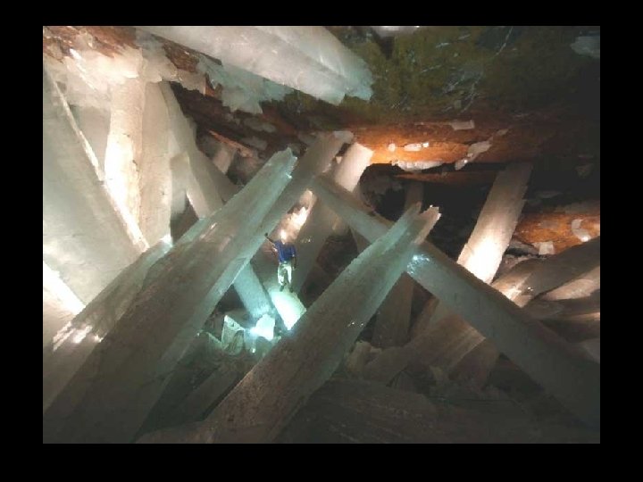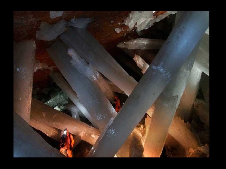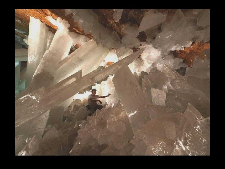 Crystal Cave situé à 300 m sous terre dans la mine de Naica, au nord de México, il ya une grotte de 27 m de long et 9 m de hauteur qui contient des cristaux géants. Les cristaux de 6 m à 11 m de longueur. Les formations ont l'apparence de la glace, mais la température du site est d'environ 50º C et l'humidité est de 100%, ce qui empêche une personne d'y séjourner plus de 10 minutes sans y risquer un choc thermique.