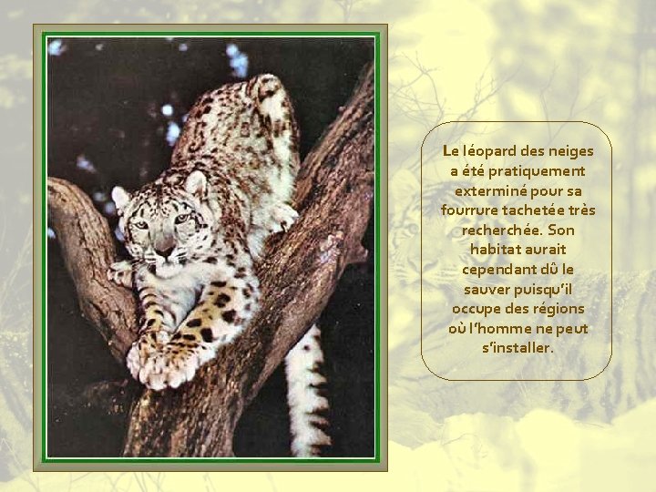 Le léopard des neiges a été pratiquement exterminé pour sa fourrure tachetée très recherchée. Son habitat aurait cependant dû le sauver puisqu’il occupe des régions où l’homme ne peut s’installer.