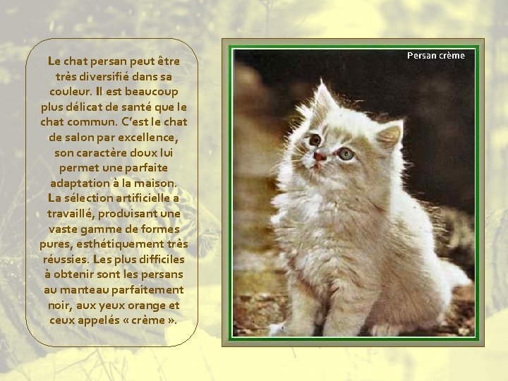 Le chat persan peut être très diversifié dans sa couleur. Il est beaucoup plus délicat de santé que le chat commun. C’est le chat de salon par excellence, son caractère doux lui permet une parfaite adaptation à la maison. La sélection artificielle a travaillé, produisant une vaste gamme de formes pures, esthétiquement très réussies. Les plus difficiles à obtenir sont les persans au manteau parfaitement noir, aux yeux orange et ceux appelés « crème » . Persan crème