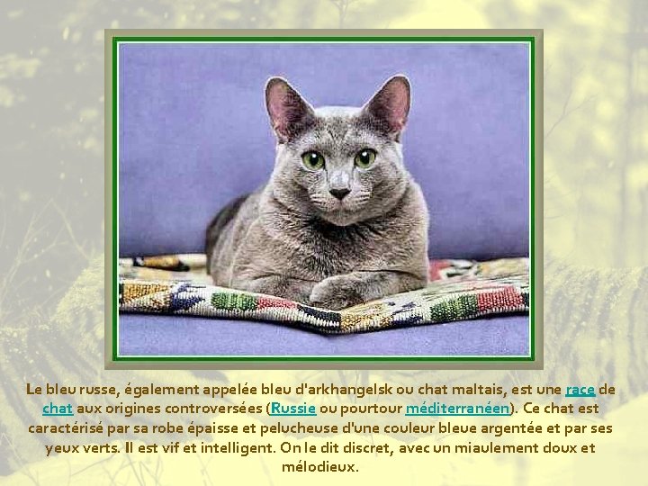 Le bleu russe, également appelée bleu d'arkhangelsk ou chat maltais, est une race de chat aux origines controversées (Russie ou pourtour méditerranéen). Ce chat est caractérisé par sa robe épaisse et pelucheuse d'une couleur bleue argentée et par ses yeux verts. Il est vif et intelligent. On le dit discret, avec un miaulement doux et mélodieux.