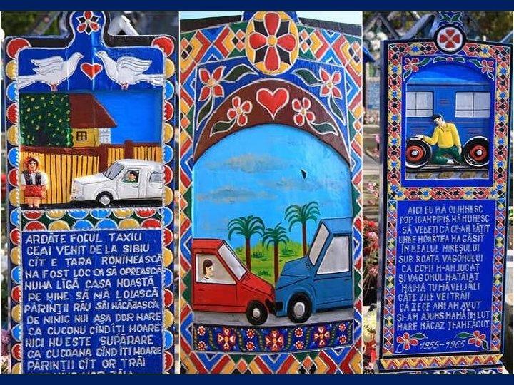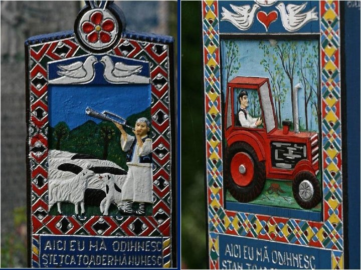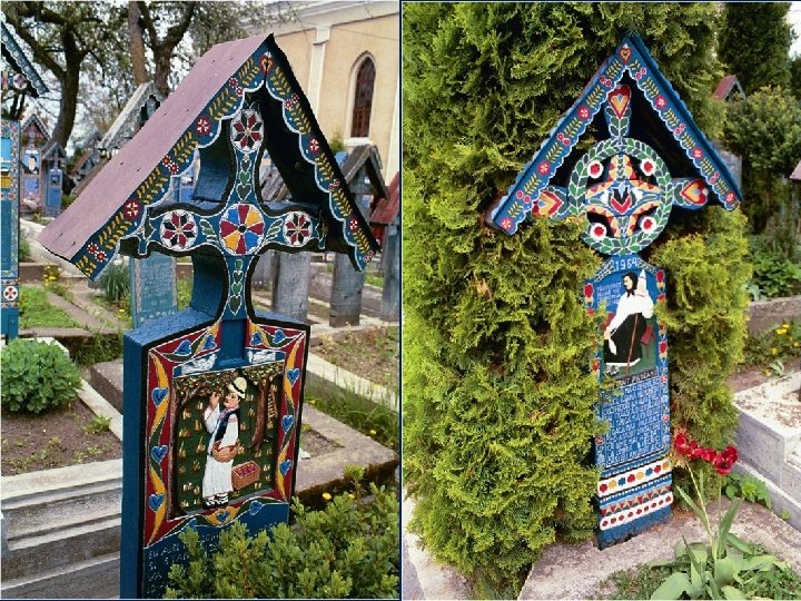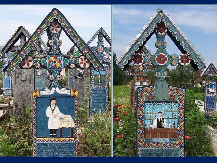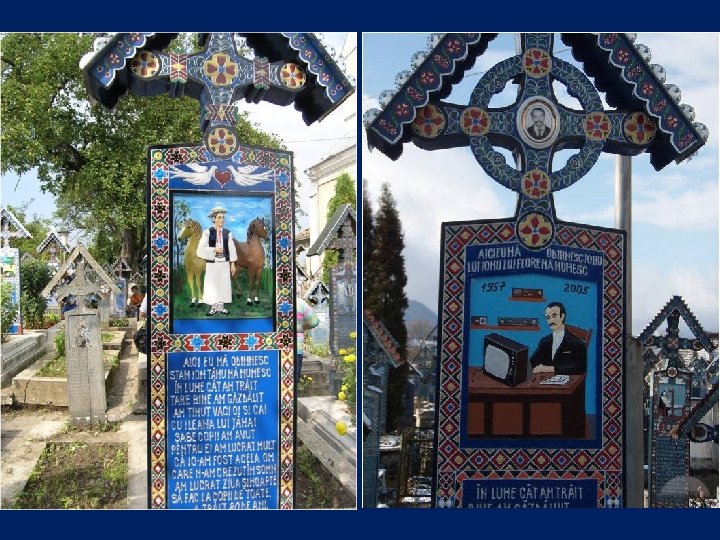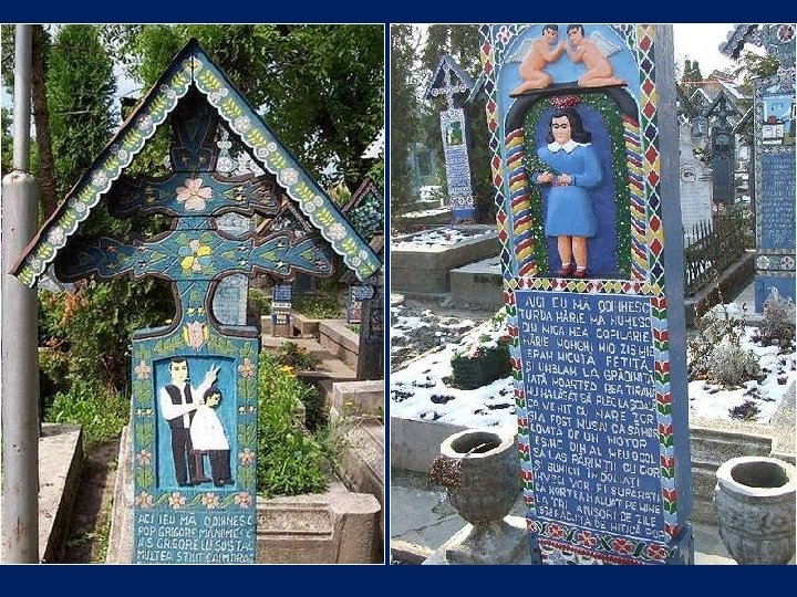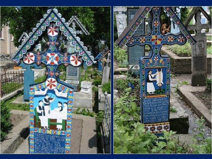 Il est célèbre par ses tombes avec des peintures colorées qui décrivent, d'une manière originale et poétique, les personnes qui sont enterrées là, ainsi que scènes de leurs vies. Znan je po svojih grobov s pisanimi slikami, ki opisujejo, v izvirniku in poetično ljudi, ki so tam pokopani, pa tudi prizore iz njihovega življenja.