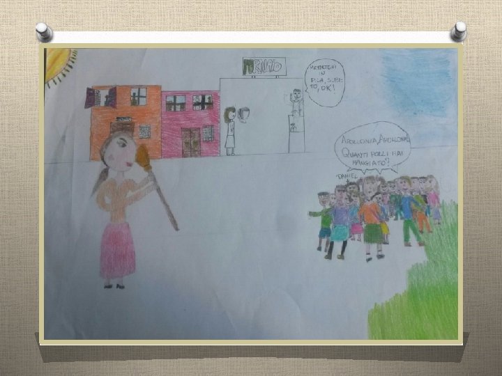 Anche Daniel le gridava «Apollonia, quanti polli hai mangiato? » se no i bambini non lo avrebbero più voluto a giocare con loro. Daniel però si nascondeva dietro gli altri. Sperava che Apollonia non lo vedesse. La portinaia Apollonia era una strega, e Daniel ne aveva una paura tremenda. Sua mamma lo aveva sgridato. Diceva che strillare stupidaggini alla gente non faceva ridere nessuno. Diceva anche Apollonia sembrava arcigna, ma in fondo era buona come il pane. Ecco perché la mamma sbagliava. Il pane lo mangiavano perché avevano una grande fame, ma non era buono. C’era la guerra e il pane non bastava per tutti. I fornai per farlo pesare di più mischiavano alla farina chiodi, pezzetti di spago e altre cose. Così il pane sembrava più grande, ma non era buono. E nemmeno Apollonia era buona. Ma la mamma non lo capiva e certe volte si fermava a parlare con lei. Daniel allora si nascondeva il più possibile dietro alla sua gonna e ogni