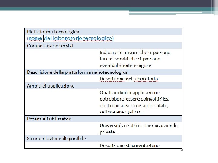Registro delle competenze • Descrizione delle piattaforme tecnologiche dei LNF attraverso schede consultabili in modo trasversale: • Competenze • Strumentazione • Materiali Aziende LNF • Tecnologie • Filiere