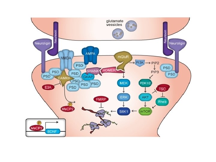 La protéine FMR 1 (FMRP) • Elle est déterminante dans la régulation de messages impliqués dans – -la maturation synaptique – -la guidance axonale – -l’apprentissage expérience-dépendant • Elle est absente chez tous les garçons atteints et chez la moitié des filles atteintes • La protéine FMRP intervient au niveau des neuro-transmetteurs GABA et glutamate-dépendant qui interviennent dans les apprentissages • Intervient aussi au niveau des tissus conjonctifs