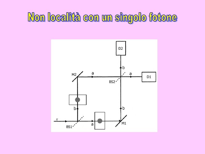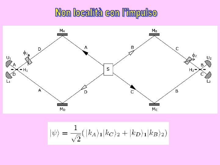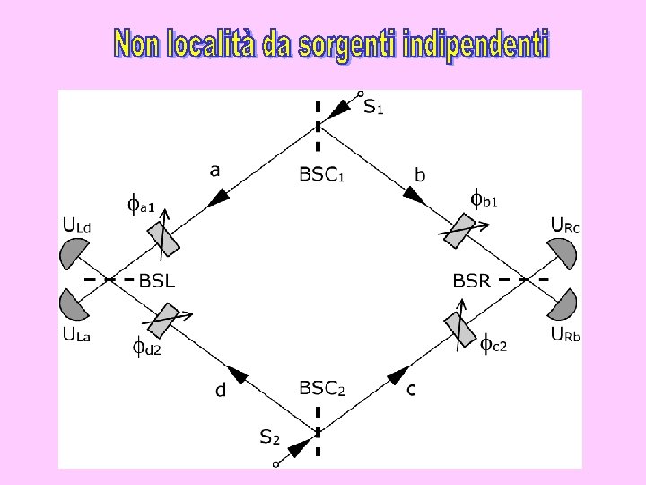 L’esperimento di Aspect con commutatori ottici. Ogni dispositivo commutatore C 1 e C 2 dirige i fotoni verso uno o verso l’altro degli analizzatori. I Polarizzatori sono a singolo canale e hanno diverso orientamento.