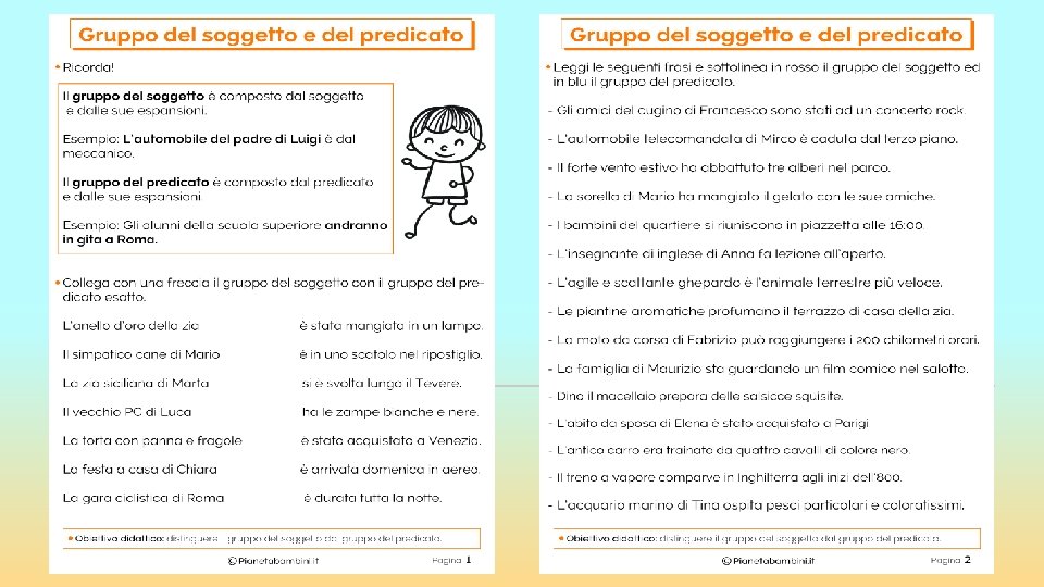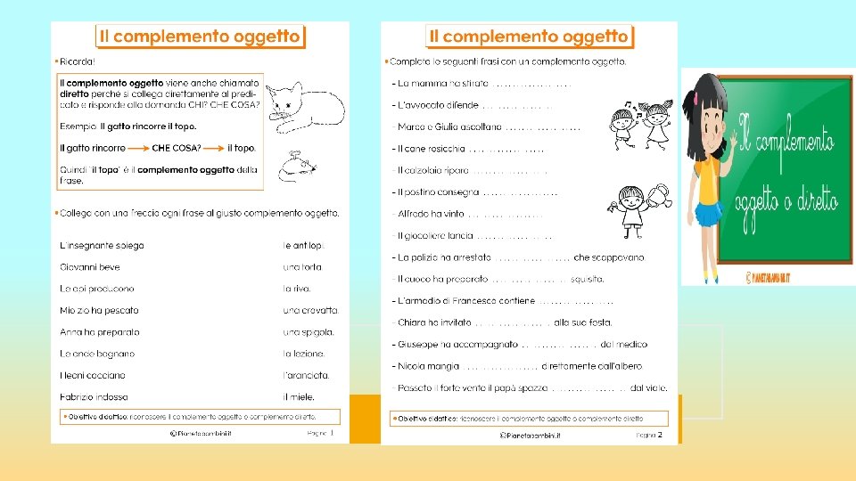 ESPANSIONI DIRETTE ED INDIRETTE Le espansioni possono essere dirette ed indirette. Si dice espansione diretta il sintagma che segue il predicato è introdotto da un articolo e risponde alle domande Chi? Che cosa? Es. : La maestra chiama l’alunno La maestra = soggetto chiama = predicato verbale l’alunno = espansione diretta ( Chi? ) ES. : Il bimbo mangia un gelato Il bimbo=soggetto mangia= predicato verbale un gelato= espansione diretta ( Che cosa? ). L’espansione diretta è una sola, segue immediatamente il predicato e viene chiamata in analisi logica complemento oggetto. Tutte le altre espansioni che rispondono alle domande : Quando? Dove? Con chi? . . . , sono espansioni indirette e forniscono informazioni su quando, dove o con chi si svolge l’azione. Ora proviamo ad esercitarci per acquisire questa ultima conoscenza. Per questo anno abbiamo completato, ci vediamo il prossimo per continuare a conoscere sempre meglio la nostra lingua.