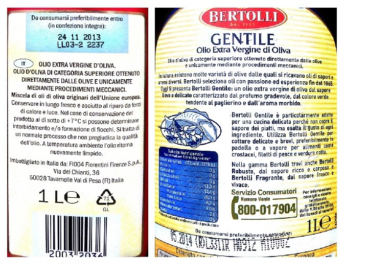 Alcune considerazioni Etichette ricche di indicazioni alimentari sono sinonimo di qualità del prodotto Generalmente un prodotto di qualità viene valorizzato elencando le sue proprietà nutrizionali e pubblicizzando la natura e l’origine dei suoi ingredienti Ad esempio Sulla bottiglia dell’olio di oliva basterebbe indicare “olio extra vergine di oliva”, la dicitura “olio extra vergine di oliva di prima spremitura” è un’aggiunta che potrebbe portare all’incriminazione del produttore per dichiarazione falsa. La descrizione del metodo di produzione, certificazioni di qualità, ricette, numero verde, eventuali siti web, …. contribuiscono ad elevare ulteriormente la qualità del prodotto