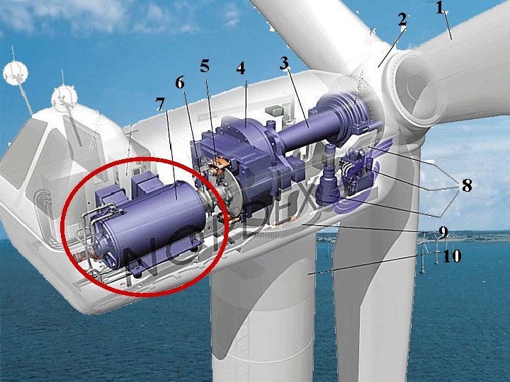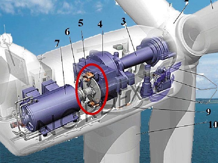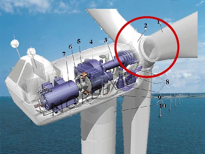 Schéma d’une nacelle (modèle NORDEX 1000) 1 - pale. 5 - frein à disque 2 - moyeu. 3 -arbre de transmission ( lent). 6 - arbre rapide 1&2 - le rotor. 4 - multiplicateur. 7 - génératrice. 8 - système de commande 9 - système d’orientation. 10 - tour.