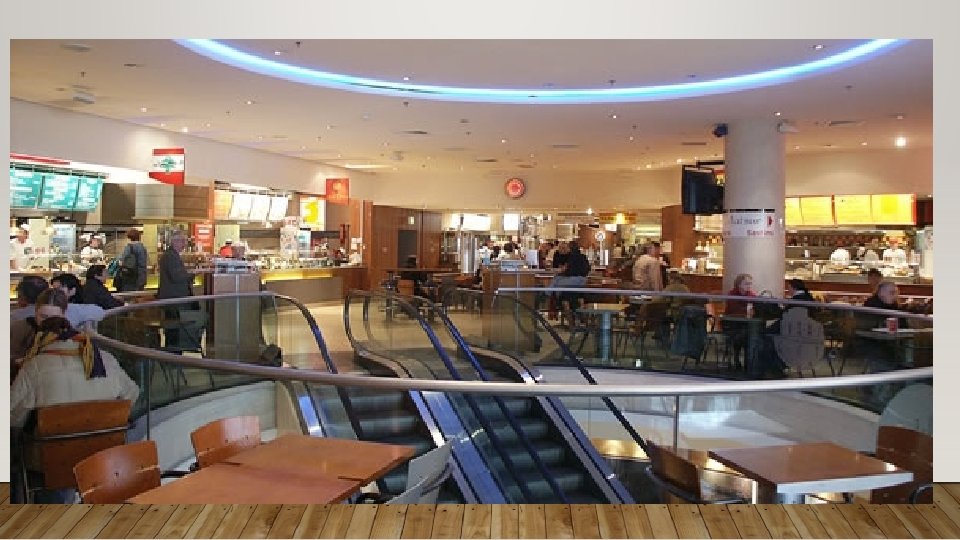 LE PRINCIPE • Le regard est attiré par des écrans plats qui vous souhaitent la bienvenue dans 5 langues différentes relatives aux thématiques culinaires. • Chaque client commande une spécialité au comptoir de son choix et va ensuite s’installer aux tables et chaises communes à tous les restaurants. • Chaque comptoir recrée l'ambiance d'une région du monde et propose une sélection des meilleures spécialités locales. • Les clients peuvent voir les cuisiniers à l'œuvre derrière leurs comptoirs • Possible de wifi gratuit pendant 30 minutes