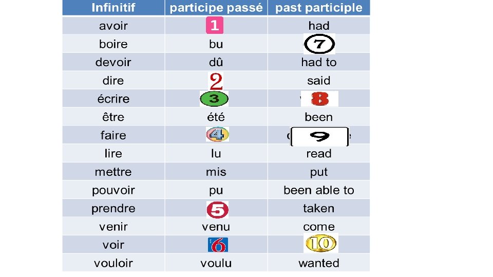Ecrivez des phrases (write sentences) 1 je 1. j’ai ecouté de la musique. écouter 2. Tu as bu une coca. 2 tu boire 3. Il a joué au rugby. 4. Nous avons fini nos devoirs. 3 il jouer 5. Vous avez écrit un livre. 6. Elles ont fait du shopping. 4 nous finir 5 vous faire 6 elles écrire