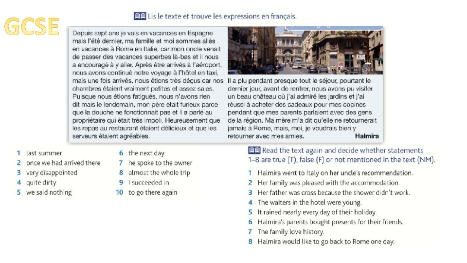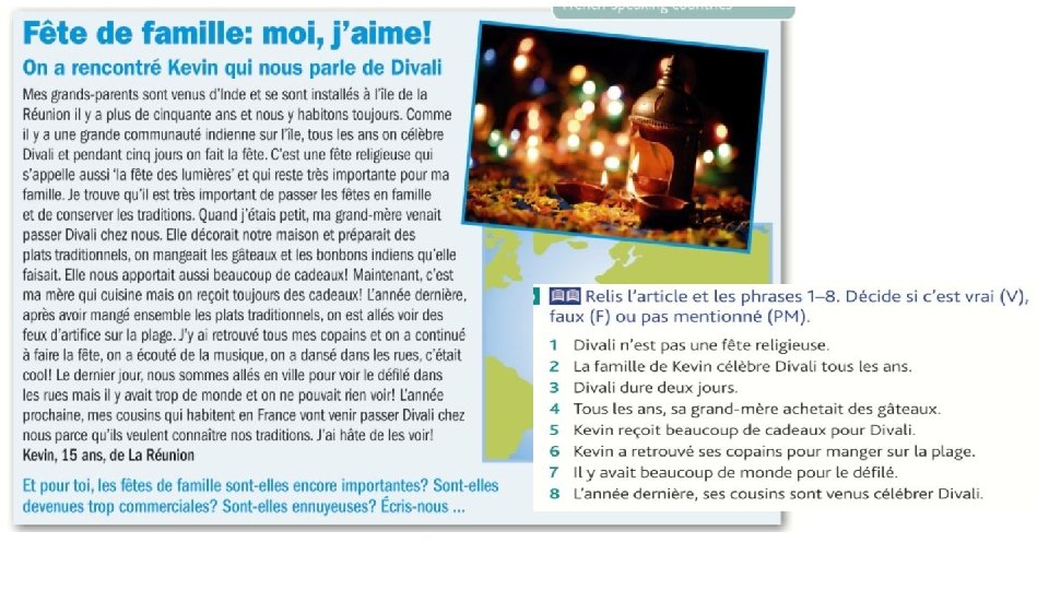 1. F 2. V 3. F 4. F 5. V 6. F 7. V 8. PM Quand j’ étais petit, je célébrais Diwali avec ma famille. Tout le monde venait chez nous. Ma mère préparait beaucoup de plats différents et on mangeais ensemble. L’année dernière, je suis allé chez mon oncle et j’ai passé trois jours avec mes cousins. C’était super!