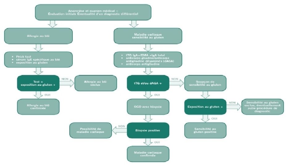 INTOLÉRANCE AU GLUTEN ou MALADIE COELIAQUE Protocole de détection de la maladie : En cas de symptômes évocateurs et inexpliqués par une autre affection ou si une ou des personne(s) de votre famille proche sont touchée(s), votre praticien vous adresse alors à un gastro-entérologue pour un bilan complémentaire, qui se déroule en plusieurs étapes : Une prise de sang permet de recher des anticorps transglutaminase tissulaire, de classes Ig. A et Ig. G et des anticorps anti-endomysium de classe Ig. A (les plus spécifiques de la maladie). S’ils sont absents, l’intolérance au gluten est peu probable. À l’inverse, la présence de ces anticorps renforce l’hypothèse d’une maladie cœliaque. Pour mettre en évidence une prédisposition génétique, le médecin demande un typage génétique HLA de la personne : examen mettant en évidence les gènes HLA DQ 2 et HLA DQ 8, souvent présents dans l’intolérance au gluten.