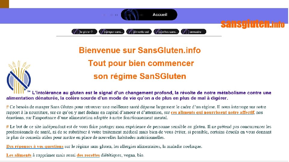 INTOLÉRANCE AU GLUTEN ou MALADIE COELIAQUE Evolution de la maladie : L’adoption d’un régime alimentaire sans gluten permet : - la disparition des symptômes en quelques semaines et des anticorps au bout d’ 1 an; - la guérison des tissus intestinaux endommagés (à plus ou moins long terme) ; - la réduction des risques de complications ; - chez le petit enfant, la fin de la diarrhée, la normalisation du comportement et le rattrapage des courbes de croissance.