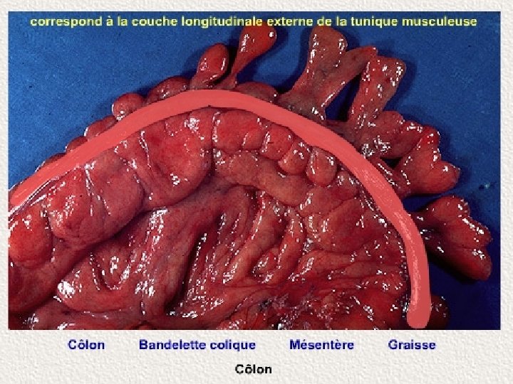 La musculeuse � � ü ü ü Disposition habituelle en deux couches. Elle diffère de celle de l’intestin grêle par: La disposition de nombreux élastiques entre les deux couches. La présence de renforcements de la couche longitudinale: les bandelettes caeco-coliques. L’existence de renforcements de la couche circulaire réalisant de véritables sphincters.