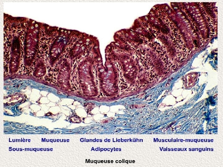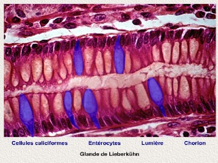 La muqueuse Elle comporte un épithélium de revêtement à majorité de cellules caliciformes qui s’invagine dans la muqueuse en glandes de Lieberkühn. � L’épithélium comprend également: Les entérocytes ou cellules à plateau strié. Les cellules endocrines : Elles sont situées dans la moitié profonde des glandes. Elles sont représentées par des : - Cellules entérochromaffines (sérotonine, motiline) - Cellules de type L (glucagon). Il n'existe pas de cellule de Paneth. � Le chorion est riche en tissu lymphoïde (lymphocytes diffus et follicules lymphoïdes débordant vers la musculaire muqueuse). �