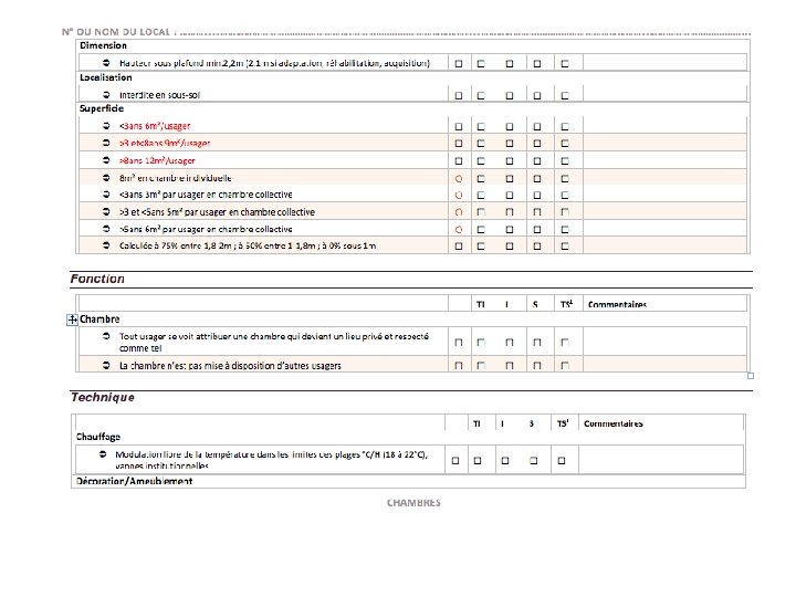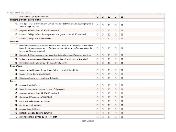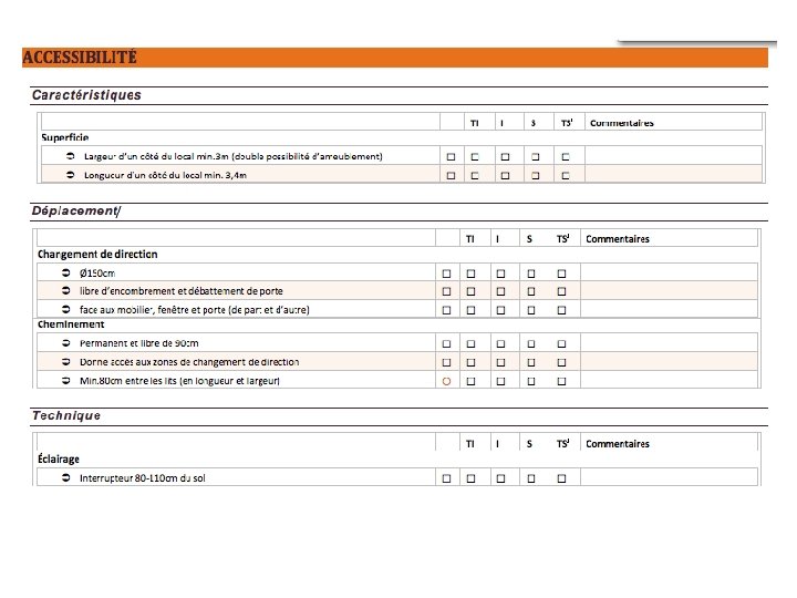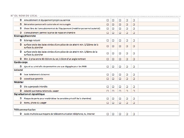 Conclusion • Grâce à ces fiches d’analyse, le responsable pourra réaliser son auto-évaluation au niveau infrastructure et mener une réflexion continue en lien avec les besoins des bénéficiaires actuels et à venir. • La présentation sous forme de checking permet une meilleure visualisation des priorités d’aménagement à envisager pour améliorer le bien être des bénéficiaires.